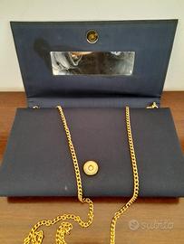 pochette blu in stoffa con catena per tracolla. presenta una macchia all'interno come da foto dove situato specchio.