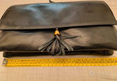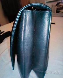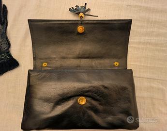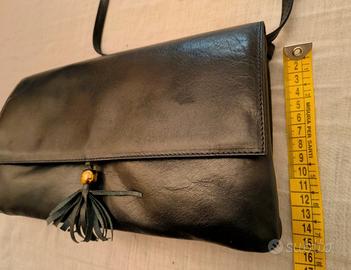 Elegante pochette in pelle blu notte, perfetta per completare un outfit. In omaggio un paio di guanti in rete con polsino volant made in Italy. - Misure: 29x15 cm; - Tracollina removibile con attacco a bottoni interni; - Due scomparti + taschina zip; - Materiale: Pelle; - Dettaglio: Nappa e perla dorata; - Colore: blu scuro. Vendita e consegna esclusivamente tramite piattaforma con spedizione tracciabile.