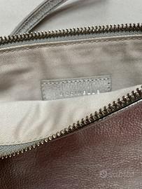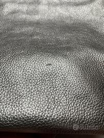 Pochette/borsa in pelle martellata color argento. Tracolla staccabile e cover originale. Mai indossata e utilizzata, pero’ presenta un leggerissimo graffio dietro ( vedi foto). Capiente e morbida . Altezza 20 cm, lunghezza 27 cm.