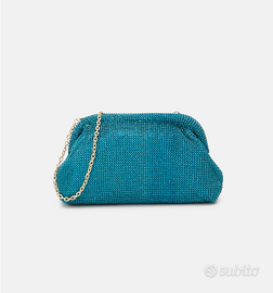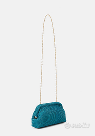 Pochette Mascara (modello floppy diamonte), colore petrol, completa di tracolla a catena dorata. Interno della pochette satinato.