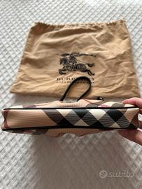 Pochette Burberry autentica realizzata in tela nova check, rivestita in vinile con finiture in vernice nera e hardware color peltro. L'interno è foderato in tessuto beige e c’è una tasca laterale.