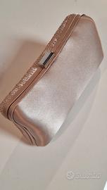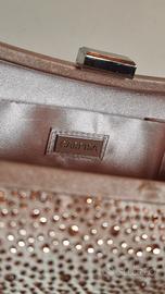 Pochette rosa rigida con fronte glitterato e retro in raso, come all'interno. Usata in una sola occasione, è perfetta. Misura 20cm x di altezza 11 spessa circa 7 essendo un po' bombata.