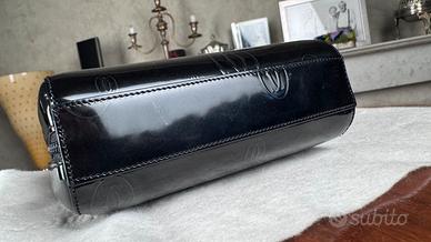 Iconica pochette Cartier Must de Cartier, realizzata in pelle verniciata nera con motivo Double C impresso a rilievo.