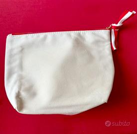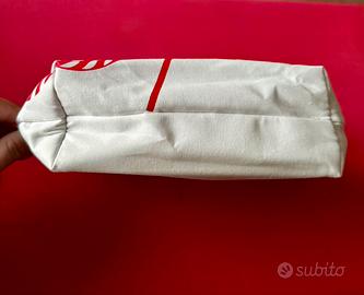 Pochette bianca con stampa lecca-lecca rossi. Dotata una pratica zip e un laccetto a righe bianche e rosse per la chiusura. - Dimensioni: 24x17x7,5 cm. - Prodotto con fibre nati e riciclate. - Ideale come porta trucchi o prodotti da bagno. - Logo stampato all’interno.