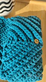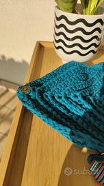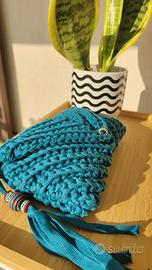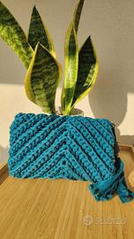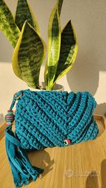 Pochette realizzata a mano con fettuccia di cotone e nappina. Color petrolio Larghezza 21 cm. Altezza 13 cm. Chiusura con bottone automatico.