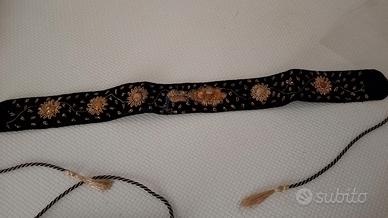 Pochette cm. 20x12 con cintura cm. 65 più lacci. Base in velluto nero con disegni in filo dorato e pietre dure fatta in India