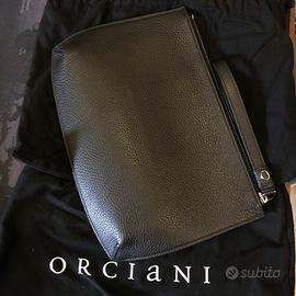 ORCIANI Pochette con manico in pelle colore nero. Inserti e logo frontale in argento. larghezza: 32 cm altezza: 33 cm Costo €230,00