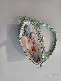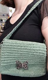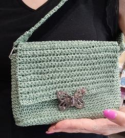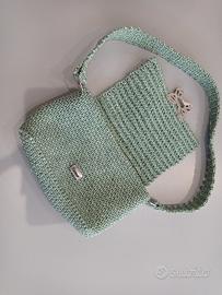 Pochette a spalla realizzata all'uncinetto in cordoncino, foderata, con tracolla corta.
