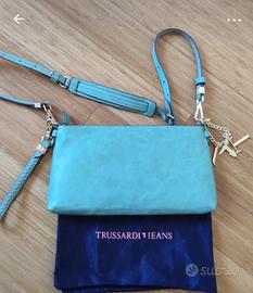 Pochette in ecopelle Trussardi Jeans. Colore verde giada. Tracolla e manichetto rimovibili. Parte anteriore lavorata ad intreccio. Zip e tasca interna, completa di dust bag e catena con charm che all’occorrenza diventa anche bracciale. Usata solo una volta , pari al nuovo. Misure cm. 32x17 esclusa tracolla.