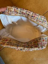 pochette o borsa per trucchi originale Cruciani in tessuto multicolore effetto tweed e similpelle bianca