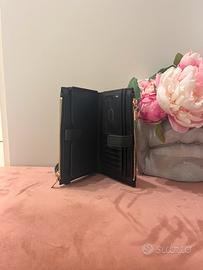 Pochette da polso originale, Guess nera e oro a portafoglio ideale per portare tutto a piccole dimensioni, originale autentico con scritta Guess centrale colore oro