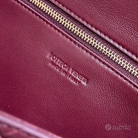 Pochette Bottega Veneta Intrecciato, con finitura metallica intrecciata, chiusura annodata, in pelle di agnello Colore: Borgogna Dimensioni: 31*13*3 cm Nuova, mai usata, spedizione entro 1-3 giorni dall'acquisto