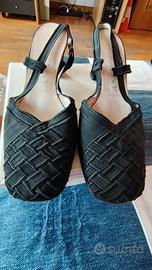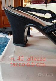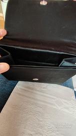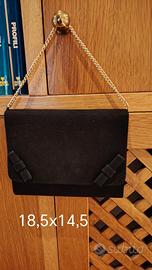 Pochette in grosgrain nero corredata da catenella e 2 piccoli fiocchi, con specchietto in taschino , larghezza 18,5 e altezza 14,5 cm. Coordinato con scarpe tipo chanel in grosgrain nero, numero 40 con tacco di 6,5 cm.