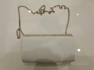 Raffinata pochette/mini borsa da sera color bianco con patta decorata da strass luminosi, ideale per cerimonie, matrimoni, feste ed eventi eleganti.
