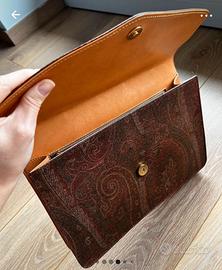 Pochette in pelle a stampa paisley, tratto distintivo del brand milanese.