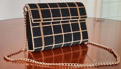 pochette nera e oro a quadrati con catena color oro in cotone fatta ad ago. Dimensioni: 27x17.