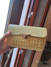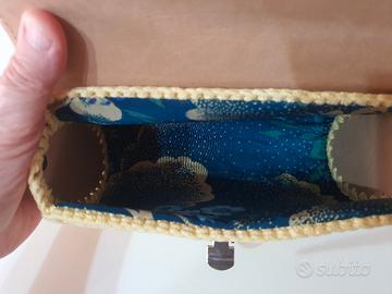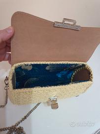 Pochette gialla fatta a mano. Il cordino è in cotone, prodotto in Italia, come la pelle frutto del lavoro di artigiani italiani. Materiali e modello sono di Federica Evaristo. Le dimensioni sono larghezza 20 cm, altezza 12cm profondità 7 cm. Foderata in tessuto con sfondo blu e motivi giallo oro. La tracolla è gli altri elementi metallici sono argentati.l