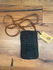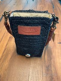 Porta cellulare\pochette marca Ibeliv realizzato a mano con materiali naturali (rafia lavorata all’uncinetto) e con inserti in vera pelle, mai utilizzato con targhetta. È possibile vedere tutte le caratteristiche sul sito internet Ibeliv, prezzo di vendita su sito e in negozio di 120€.