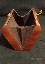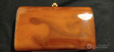 pochette in bachelite, stile tartaruga chiaro, chiusura dorata a clip. Misure cm. 19 × 12 × 5,5.Vintage. Essendo usata data la superficie lucida, presenta qualche piccolo striscio