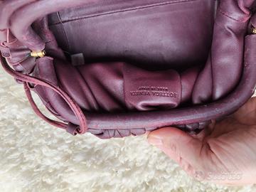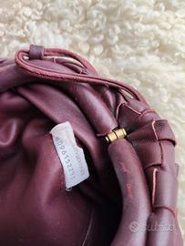 usata, condizioni come da foto. uno dei passanti per il cordino in pelle (per renderla a tracolla) è rotto. vera e morbidissima pelle. colore bordeaux/ vinaccia.