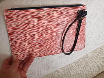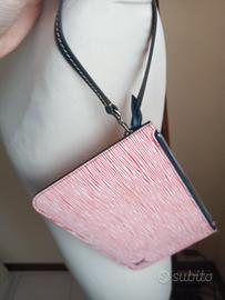 Pochette Louis Vuitton facente parte di una serie limitata, in pelle epi bianca e rossa con interno in Alcantara blu con la tracollina in pelle sempre blu, la cerniera e la tiralampo è color argento lucido.