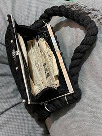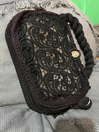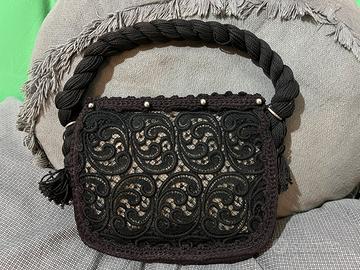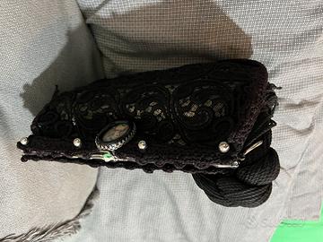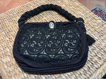 Pochette in pizzo nero con spilla raffigurante dama d’epoca.la borsetta é riconducibile ai primi anni 50,oggetto vintage di rara bellezza,misura:25x20 con manico in lana arrotolato che misura 45 centimetri.Unica da collezione (trattativa riservata)