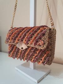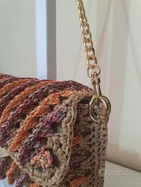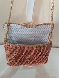 Piccola pochette in rafia naturale beige e con lavorazione multicolore. La chiusura, in metallo dorato, è a girello. Interamente foderata con tessuto di cotone a sfondo chiaro con piccoli motivi in tinta. La tracolla è anch'esso in metalli dorato lunga 120 cm. Le dimensioni della borsetta sono 24 cm larghezza, 15 cm altezza e 5 cm profondità