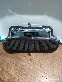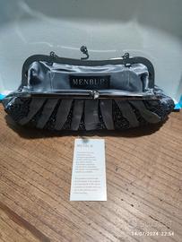 vendo pochette in raso grigia decorata con pietrine grigio scuro/nero Menbur. Dimensioni cm. 25 alla base, altezza cm. 10,5.