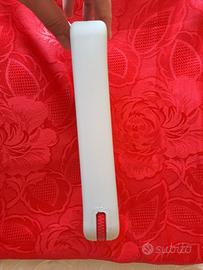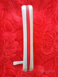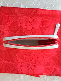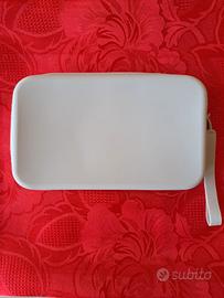 Pochette in silicone resistente all'acqua, di color grigio chiaro, con cerniera rossa. Comodo manico al polso.