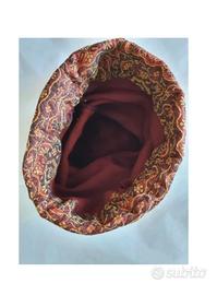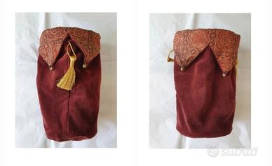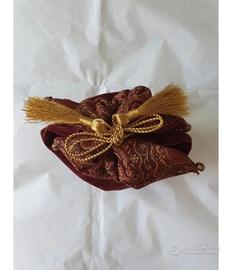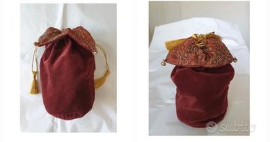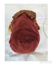 Pochette degli anni '80, in eccellenti condizioni, a base circolare, in velluto bordeaux e seta sfondo oro fantasia multicolore, campanellini agli angoli, e in chiusura cordoncino in passamaneria, base esterna trapuntata. Misure: altezza cm 21, diametro cm 10, circonferenza cm 34.