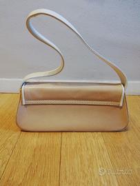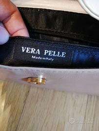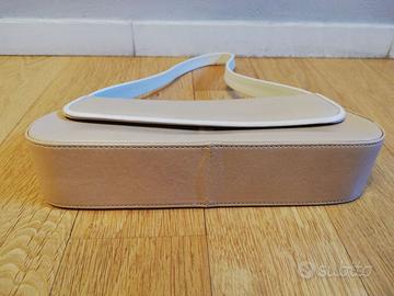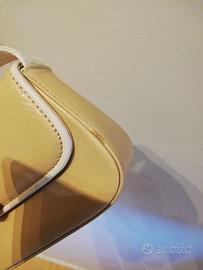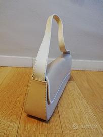 Colore beige, con manico e bordino in pelle bianca. Chiusura con bottone magnetico e una piccola cerniera all'interno, rivestimento interno in tessuto nero.