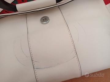 Elegante pochette Krizia in pelle bianca, perfetta per ogni occasione. Caratterizzata da un design pulito e un distintivo cerchio nero. - Pelle morbida al tatto. - Chiusura a patta. - Dettaglio cerchio in contrasto. -presenta un piccolo difetto come è visibile nella foto 6 ma quando è chiusa non si vede