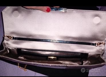 Pochette originale, color argento e oro, graziosa ed elegante. Morbida, spaziosa e mantiene la sua forma, il tessuto liscio (viscosa e seta), la rende piacevole al tatto. Le paillettes di impeccabile fattura, la rendono davvero brillante e seducente. Usata solamente 2 volte, è in condizioni eccellenti. Da usare come pochette o come tracolla, grazie alla catenella dorata che le dona quel tocco di raffinatezza e fascino.