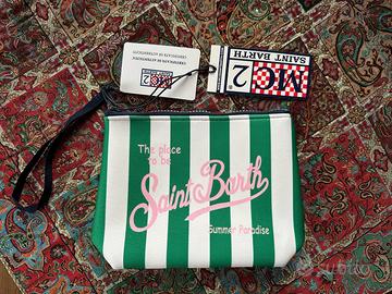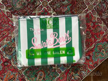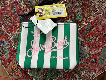 Vendo pochette MC2 Saint Barth a righe bianche e verdi con logo rosa. Condizioni perfette con cartellini e bustina trasparente, tirata fuori solo per fare le foto. Misura 20x15, materiale ottimo per l’estate essendo impermeabile all’acqua.