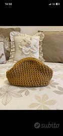 Pochette media color senape in fettuccia di cotone e chiusura a molla, personalizzabile. Possibilità di inserire la tracolla a piacimento.