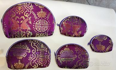 Set di Pochette / Portafoglio in seta damascata. Set di varie misure, in seta damascata viola, con disegni color oro, chiusura con cerniera. Ottimi per l'uso con abbigliamento Indian Style, mediorientale o similare. Il set comprende 5 pezzi