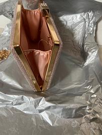 Elegante pochette gioiello. Chiusura a scatto impreziosita da brillantini.Dotata di catenella colore oro come tutti i dettagli colore oro. Interno foderato in raso.