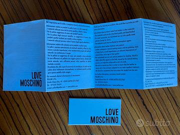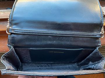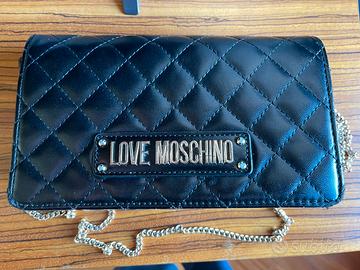 Pochette Moschino Love nera con tracolla in catena dorata, leggeri segni di usura nei bordi, dimensioni cm. 22x6x15H.