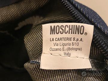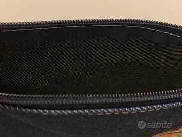 Pochette/bustina/astuccio originale anni ‘80, prodotta da Panini per la casa di moda Moschino. In jeans, con applicata la figura in plastica di una fragola morsicata.