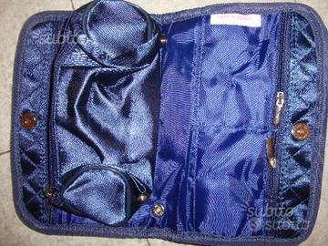 E' una pochette blu notte elegantissima e con moltissime tasche e zip di sicurezza e alcune parti possono anche essere estraibili per il trasporto separato. Ad esempio solo porta occhiali o cellulare/Smarthphone. Oggetto assolutamente unico ed introvabile provate pure a cercarlo in giro non esiste niente del genere.