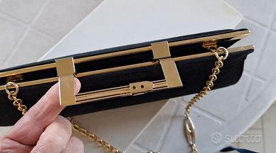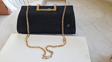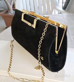 Stupenda pochette in pelle scamosciata colore nero, vintage anni '70. Gli accessori sono in metallo dorato e tracolla a catenella. La chiusura è molto originale “a scatto”. All’interno è foderata in ecopelle nera e ha una tasca con zip.