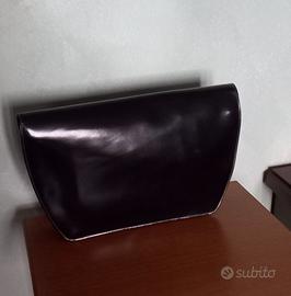 elegante e raffinata pochette in pelle lucida nera, dimensioni 35x20 circa, usata pochissimo, chiusura con bottone dorato, taschino interno chiuso con cerniera e targhetta con marca
