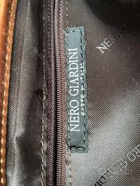 Elegante pochette NeroGiardini realizzata in vera pelle color marrone cuoio, con chiusura a clip e tracolla regolabile.