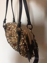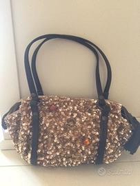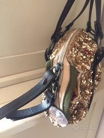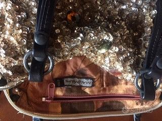Pochette con manici, Maliparni originale! Molto bella , con strass e pietre nei colori dell'oro, su colore di base marrone/nero. Seminuova; portata solo ad un matrimonio.