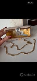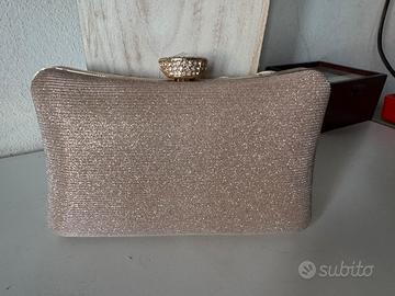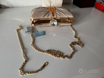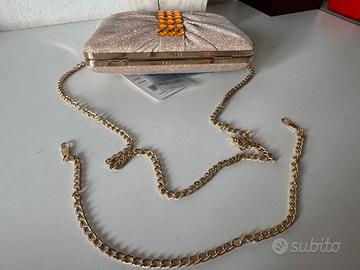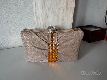 Elegante pochette color oro, perfetta per occasioni speciali. La sua superficie scintillante e le applicazioni di strass la rendono un accessorio di tendenza.