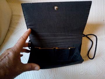 pochette con tracolla, fronte tutto con paillettes e lustrini; retro, lati e interno seta nera, taschini interni profilati oro; usata pochissimo, ottima, molto carina. Misure 20x13