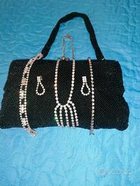 Pochette perline nere cm 20x12 in ottime condizioni fodera interna intatta + parure strasse composta da collana, 2 braccialetti, orecchiini con perno per buchi
