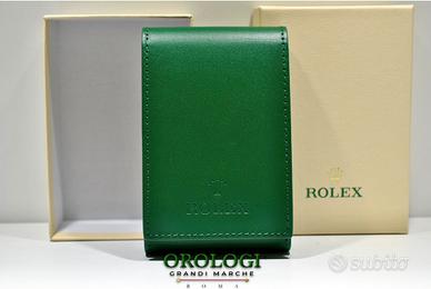 Pochette porta orologi originale Rolex in vera pelle, cuciture resistenti, chiusura con doppio bottone, anima rigida antigraffio e serigrafia ROLEX, completa della sua confezione originale.
