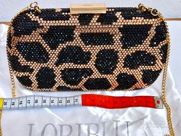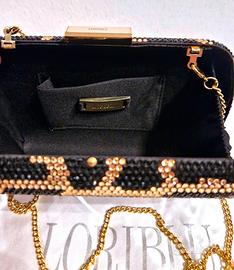 Bellissima ed elegante borsetta pochette rigida di Loriblu, completamente rivestita da strass nero e oro a fantasia animalier
