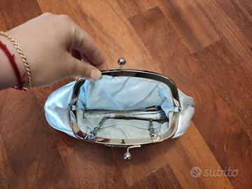 Pochette elegante in raso color argento con due tipi di tracolla removibile: una in catena a maglia piccola e l'altra in raso
